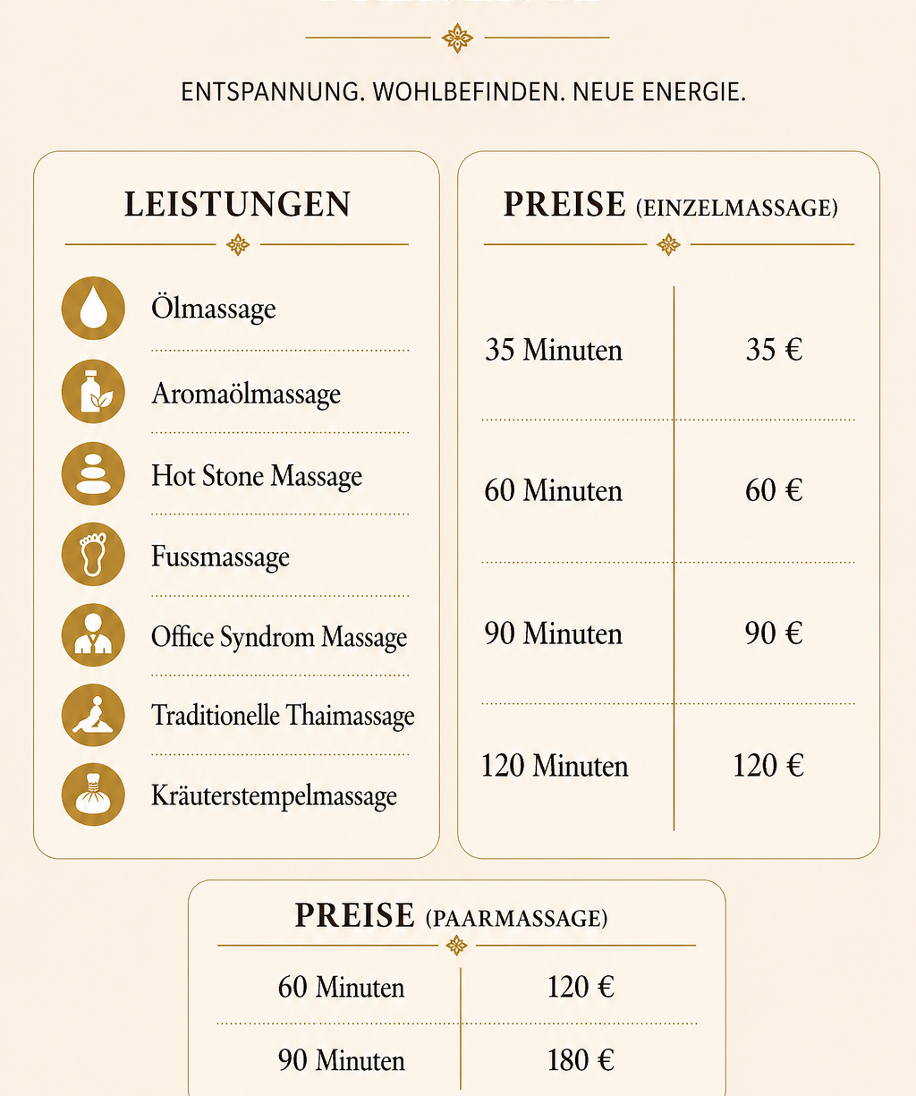 Tauchen Sie in die Welt der traditionellen Thai Massage und lassen Sie den Alltag hinter sich. Bei uns erwartet Sie eine Oase der Ruhe, in der Verspannungen gelöst und neue Energie geweckt wird.